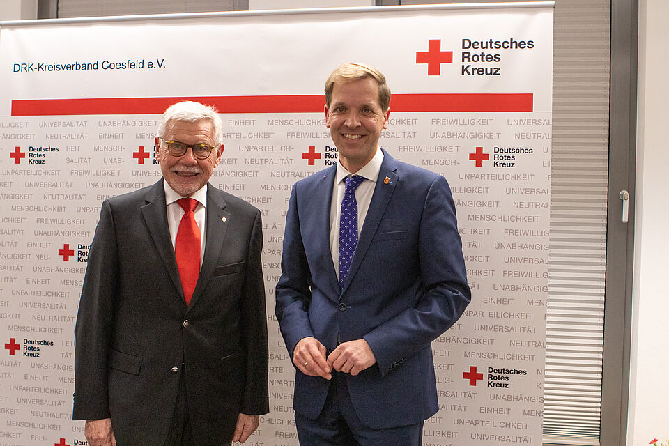Diese stand ganz im Zeichen des Abschieds und des Neubeginns. Nach zwölf Jahren an der Spitze des Verbandes übergab Präsident Konrad Püning sein Amt an Landrat Dr. Christian Schulze Pellengahr, der von den Mitgliedern zum Nachfolger gewählt wurde. Püning konnte zuvor mit Stolz die Fertigstellung der erweiterten Geschäftsstelle vermelden – ein Herzensprojekt, das seine Amtszeit krönte. Ein emotionaler Höhepunkt war die Auszeichnung des scheidenden Präsidenten mit der Landesverdienstmedaille des DRK-Landesverbandes Westfalen-Lippe, überreicht durch den Präsidenten des Landesverbandes, Dr. Fritz Baur. In seiner Laudatio würdigte Dr. Baur das langjährige Engagement und die Verdienste Pünings: „Wir haben viele Jahre Tür an Tür gearbeitet – und ich weiß, mit welcher Leidenschaft er sich für das Rote Kreuz eingesetzt hat.“ Mit großem Applaus und herzlichen Worten verabschiedeten die Mitglieder ihren Präsidenten, bevor der Abend bei Gesprächen und einem Rundgang durch das neue DRK-Zentrum ausklang.