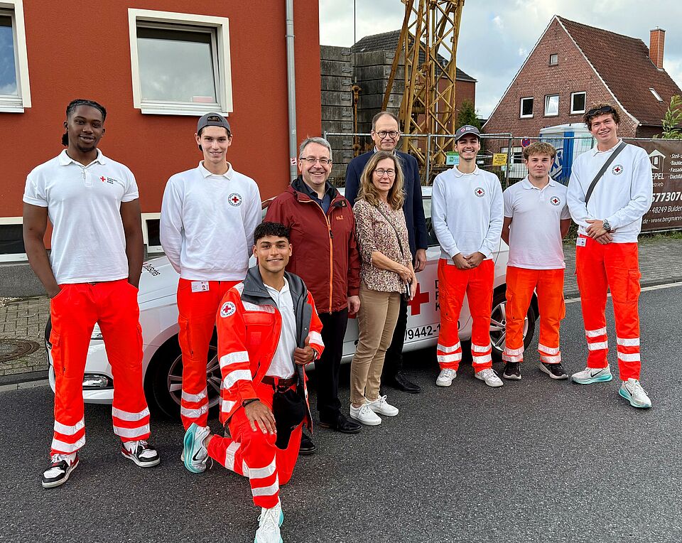 Auch wenn der ehrenamtliche Einsatz der DRKler in Buldern unbezahlbar ist, kosten Fahrzeuge, Material, Gebäude und Infrastruktur, wie in jeder anderen Organisation auch in Buldern, Geld. Damit die Hilfsangebote wie die "Helfer vor Ort", Sanitätsdienste bei Veranstaltungen und die Unterstützung bei Arztbesuchen und Einkäufen auch weiterhin zuverlässig zur Verfügung stehen, sucht der DRK-Ortsverein Buldern derzeit neue Fördermitglieder. Denn das Rote Kreuz muss einen Großteil seiner Gelder selbst genieren. ”Wir reden bei einer vollen Schutzausrüstung für einen Helfer von 2.000 Euro", bemerkt Christoph Schlütermann (Vorstand DRK-Kreisverband Coesfeld e. V., 4. v. r.) und macht deutlich, dass auch das DRK in Buldern auf die Spenden aus der Bevölkerung angewiesen ist.